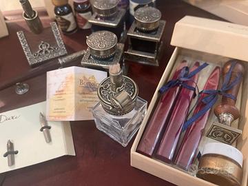 Set completo per la bella scrittura, in legno vetro e bronzo lavorato. Originale della storica fonderia Veneziana Bortoletti di alto artigianato. IL Set comprende: 2 penne ( una penna d'oca impugnatura in bronzo blu Michelangelo con pennino + 1 penna in legno e bronzo lavorati con pennino) 4 pennini aggiunti ( 2 morbidi + 2 Duri Incluso quello per scrittura gotica) . 5 boccette inchiostro ( nero rosso, marrone blu Michelangelo e viola). 3 boccette inchiostro, vetro e bronzo lavorati, due con vano porta penna. Stoppino vetro e bronzo lavorato + 3 stik Ceralacca lacca rosso cardinale + timbro sigillo con la lettera gotica E + tampone legno e bronzo con kit cartine assorbenti. Un set da collezione unico nel suo genere con tutto corredato. Incluso un Piano appoggio scrittura in vera pelle 55x40. Tutto ottime condizioni con scatole originali Bortoletti. Scrivere per più informazioni o specifiche. ( per ritiro a Mano zona Arco della Pace a Milano.)