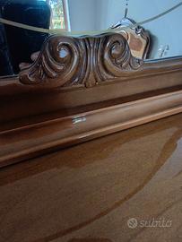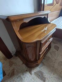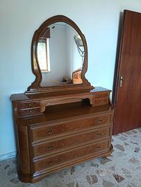 Splendido set da camera da letto completo, in legno intarsiato di fine fattura, anni 60/70. Il set è in buone condizioni vintage e presenta eleganti dettagli intarsiati, come visibile nelle foto. Il set comprende: Armadio: 6 ante, di cui 3 centrali a specchio. Internamente spazioso, con appendiabiti e ripiani. Ottime condizioni generali, piccoli segni del tempo. Letto: Matrimoniale con testata e pediera intarsiate. Rete inclusa. Materasso non incluso. Comò: 3 ampi cassetti, con piano in legno e specchiera originale con cornice lavorata. 2 Comodini: Ciascuno con cassetto e vano a giorno. 2 Poltroncine: Struttura in legno e rivestimento in velluto color senape. Condizioni: Il mobile è usato ma ben conservato. Presenta lievi segni d'usura e del tempo, come visibile in foto (es. piccoli graffi, qualche imperfezione sulla lucidatura). Nel complesso, è solido e perfettamente funzionale. Si prega di visionare attentamente tutte le immagini per i dettagli sulle condizioni. Resto a disposizione per ulteriori immagini. Dettagli importanti: Solo ritiro a mano a Dipignano (CS). Smontaggio e trasporto sono a totale carico dell'acquirente. Ideale per chi cerca un mobile dal fascino d'altri tempi, per arredare con stile una camera o per un progetto di restauro.