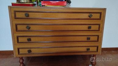 Descrizione Vendo coordinato camera da letto in stile vintage anni '60/'70, composto da un comò (cassettiera) e un comodino abbinato. I mobili presentano un'elegante finitura in legno con venature a vista e dettagli curati. Caratteristiche del set: Design:Frontali dei cassetti decorati con cornici in rilievo e pomelli metallici quadrati originali. Gambe:Entrambi i mobili poggiano su solide gambe tornite "a cipolla", tipiche dell'artigianato classico italiano. Capienza:Cassetti ampi e scorrevoli, ideali per organizzare biancheria e oggetti personali. Condizioni:Mobili ben conservati, solidi e senza difetti strutturali. Qualche naturale segno del tempo che ne attesta l'originalità. Ideale per: Arredo vintage autentico o progetti di restauro creativo. Case in stile classico o rustico. Allestimento rapido e di qualità per B&B o seconde case.