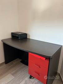 •Scrivania con piano in legno scuro e cassettiera rossa a 3 cassetti su ruote.