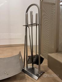 Set completo per camino in acciaio, design minimal e moderno. Include porta legna + scopina, pinza, attizzatoio e paletta. In ottime condizioni. Bello da vedere e super pratico.– pronto all’uso