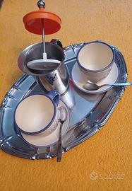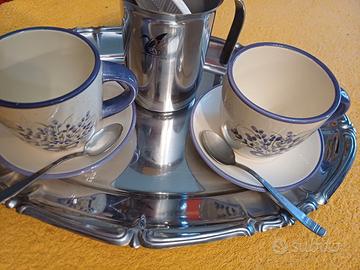 Set capuccino per 2 persone - 2 tazze disegno lavanda con piattino e cucchiaini + preparatore di latte schiumato su comodo vassoio in acciaio - poco usato in buone condizioni
