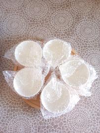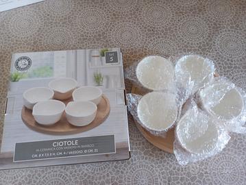 Bellissimo set di 5 ciotole in ceramica bianca, con vassoio in bamboo. Perfette per servire salse, antipasti o snack.