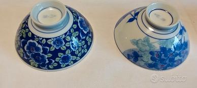 Set vintage di 6 ciotole cinesi in porcellana con decori diversi sui toni del blu e bianco. Colori luminosi. Interno di un bel bianco brillante. Diam. 12, alte 5,5 cm. nessuna sbeccatura.