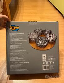 set ciotole nuovo, mai usato. set composto da 5 ciotole in ceramica, più il vassoio in bambù, ancora sigillato.