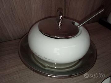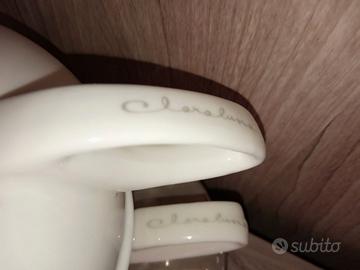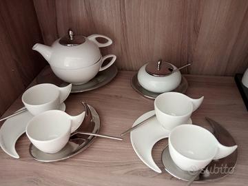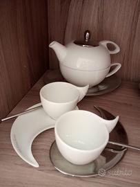 Set Claraluna composto da 4 tazzine, 5 cucchiaini, teiera e zuccheriera. I piattini della teiera e della zuccheriera sono argentati, mentre quelli delle tazzine sono uno bianco e uno argento per ogni coppia e vanno stupendamente a formare un abbraccio che ricorda il TAO (ying e yang). Collezione del 2011. Molto fine ed elegante.