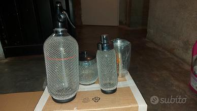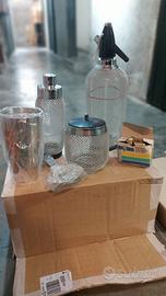 set per cocktails e seltz in vetro spesso ed esterno con foggia moderna maglia in acciaio. Completo di portaghiaccio e accessori per cocktails, in totale 6 pezzi. MAI USATO! Possibile spedizione con spese a vostro carico.
