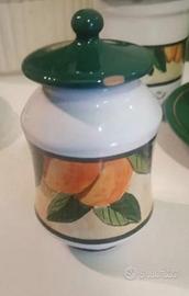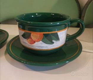 Set collezione frutta per colazione composto da 2 Tazze Da Latte, un barattolo e una zuccheriera, questi ultimi due pezzi presentano piccoli segni di sbeccatura:uno sul bordo del barattolo, l' altro sul coperchio della zuccheriera ( vedi foto). Il set è stato realizzato a mano e acquistato a Fiuggi presso l' azienda Todini.