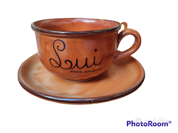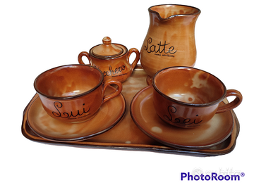Set per la prima colazione "Lui e Lei" in ceramica marca Nonna Marianna, composto da 2 tazze, 2 piattini, 1 vassoio, 1 zuccheriera, 1 brocca per il latte.