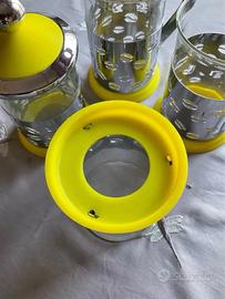 Nuovo, mai utilizzato. Bellissimo set colazione, composto da 1 lattiera, 2 tazze con manico, 1 zuccheriera con coperchio. In vetro e acciaio con base in plastica giallo limone. Idea regalo 🎁