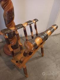 Set composto da due colonne portavaso in legno antico attorcigliato di diversa misura (96cm e 76cm) + portariviste abbinato, stessa tipologia di legno, dalle misure 42x42x25cm