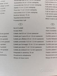 Set formato da otto coltelli in acciaio inox con rivestimento antiaderente e antibatterico. Copertura della punta della lama per riporli senza tagliarsi. Nell'ultima foto sono descritte le caratteristiche e gli usi di tutti i coltelli. NUOVI, MAI USATI nella scatola originale.