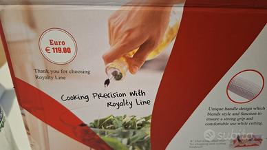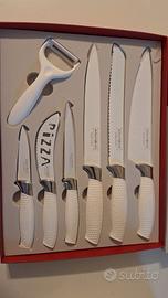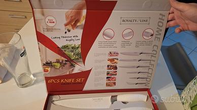 Vendo set di coltelli da cucina Royalty Line da 6 pezzi con rivestimento in ceramica, completo di pelapatate abbinato.