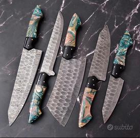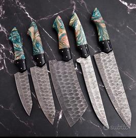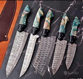 set di coltelli da cucina professionali,realizzati in acciaio damasco, con una custodia per il trasporto in pelle di bufalo,realizzati interamente a mano da un artigiano del nord america.