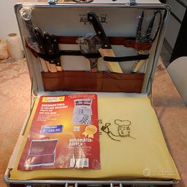 Set coltelli e posate in acciaio ancora nuovi in cellophane, completi di valigetta. 25 pezzi con kit posate per griglia.