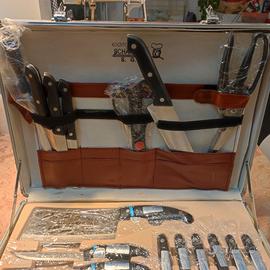 Set coltelli e posate in acciaio ancora nuovi in cellophane, completi di valigetta. 25 pezzi con kit posate per griglia.