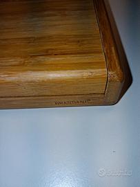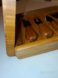 Set di coltelli per formaggi Brandani, in scatola di bambù pieghevole con fustellatura interna per ogni accessorio. Accessori in acciaio inox con manico in bambù.