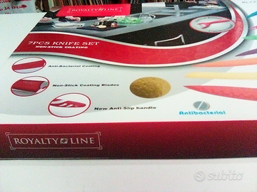 Set coltelli 7 pezzi +1 pelapatate.Nuovo.Marca:ROYALTY LINE.Non Stick Coating.7 Pcs Knife Set.Antibactering.Sigla:RL-COL7.Nuovo mai usato nella confezione originale.Prezzo di listino ?160.00.Scontato ?85.00.