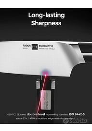 🟫 SET COLTELLI iPUREHOME FUSION 15 PEZZI – DESIGN PREMIUM + ACCIAIO TEDESCO Set coltelli da cucina iPUREHOME Fusion Series da 15 pezzi, un vero mix tra design moderno e prestazioni professionali. 🔪 Realizzati in acciaio tedesco X50CrMoV15 (HRC 58±2), garantiscono: •taglio preciso e fluido •lunga durata del filo •resistenza e qualità superiore ✨ Design unico ed elegante •manici ergonomici effetto nero lucido •blocco in legno naturale (acacia) •affilatore integrato nel ceppo 👉 perfetti anche come elemento di arredo in cucina 📦 Set completo da 15 pezzi: •coltello chef 8” •coltello slicing 8” •santoku 7” •coltello pane 8” •utility 5” •spelucchino •6 coltelli bistecca •forbici professionali •ceppo con affilatore 💎 Prestazioni top Affilatura tipo rasoio (10° per lato), taglio preciso anche su alimenti delicati. ⸻ 💰 PREZZO 👉 In vendita online a 170/180€ 🔥 Io li vendo a 100€ ⸻ ⚠️ OCCASIONE Prodotto difficile da trovare in Italia, ideale per: •uso personale •regalo di livello •cucina moderna
