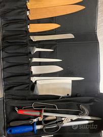 Vendo come da titolo set e valigetta cuoco con 10 coltelli professionali sia giapponesi che altri acciai di qualità ed altri accessori.