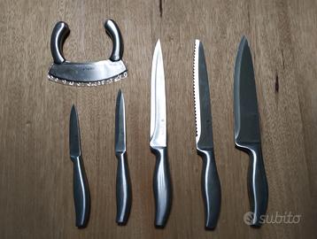 Set coltelli da cucina e mezzaluna in acciaio con ceppo in legno marca Tognana. Mai usati.