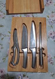 Set da cucina comprensivo di 2 coltelli, un tranciapolli, e un affila lame. Contenitore in legno con funzione da tagliere. Ottimo anche come idea regalo. Mai usato. Ritiro e pagamento a mano, zona Nonantola (MO)