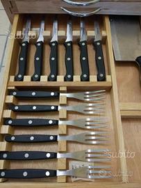 Vendo set completo di coltelli con due scompartimenti e tagliere tutto in legno da cucina inoxpran, composto da 8 coltelli x vari tipi di carne e pesce più 6 posate e 6 coltelli da tavola e Acciarino .