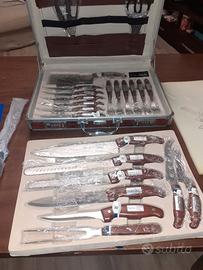 Contenuto tipico: Il set da 24 pezzi può includere coltelli da chef, coltelli per il pane, forchette da tavola, forbici, un levigatore, un tagliere per dessert e altri strumenti come un apribottiglie e un'affetta-pizza.