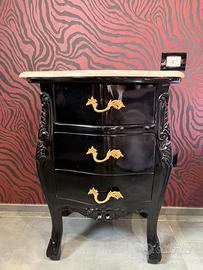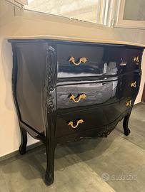 Comó e comodini composti da 3 cassetti. Appena restaurati. Colore nero lucido con maniglie oro e base superiore in marmo vero. No made in napoli, pagati oltre 3000€. Per maggiori info in pvt.