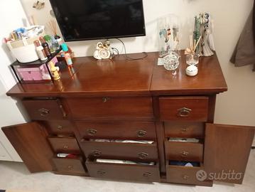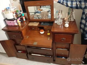 Comò (13 cassetti) con ribalta e specchio, che fa set con due comodini (3 cassetti l'uno). Mobili in arte povera, tutti in legno massello color noce. Comò completo di chiavi. Dimensioni (misurando i punti estremi): - Comò 144×53×95 -Comodini 56×36,6×67,3 Come da foto, uno dei comodini ha la maniglia del cassetto superiore rotta ma riparabile con saldatura. Tutti i cassetti si aprono perfettamente. Tutti i mobili presentano lo zoccolo inferiore. Suppellettili NON incluse.