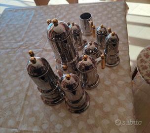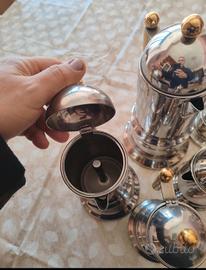 set composto da 4 caffettiere di varie dimensioni, teiera, lattiera, zuccheriera e vassoio marca ALESSI in perfetto stato di conservazione in acciaio inox e oro.