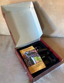 Vendo in confezione originale elegante e pratico set apribottiglie professionale. In acciaio con finiture nere, con supporto, dotato di tagliacapsule in stagnola e vite di ricambio. Scatola leggermente consumata ai bordi benché non sia mai stato utilizzato. No spedizioni.