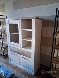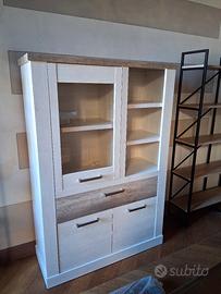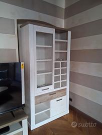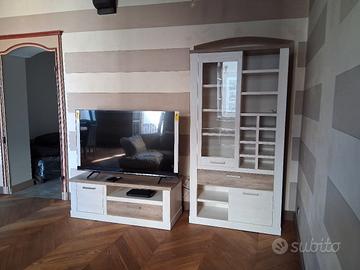 Set in laminato bianco e rovere, composto da PORTA TV (1 anta + 2 cassetti), VETRINA (2 ante + 1 cassetto), CREDENZA (3 ante + 1 cassetto).