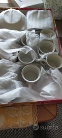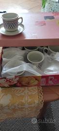 Completo nuovo mai usato, una rotta con il trasloco. Fantasia geometrica ocra e blu, presenti 11 tazzine e 11 piattini, integri con nessun difetto o rottura.