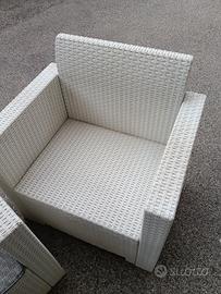 vendo set completo 2 poltrone divano 2 posti più tavolino in plastica rattan bianco come da foto