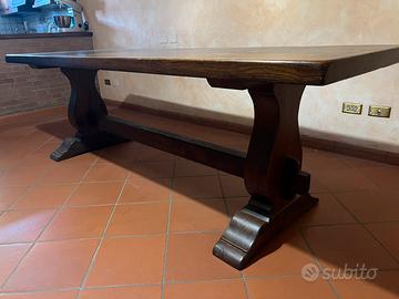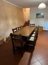 Tavolo “fratino”in legno di rovere massello, piano con spess. cm 6, mis. 250x85.Molto pesante (smontabile). In ottime condizioni, senza tarli. Compreso set di 8 sedie, sempre in rovere massello,con seduta impagliata sanissime e integre (kg.10 cad.) Posti 12/14. Tavolo non allungabile ma fisso. Usato in ottimo stato. Ritiro a Reggio Emilia,piano terra ( aiuto al carico )