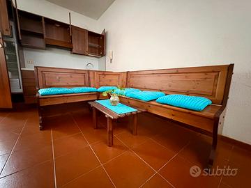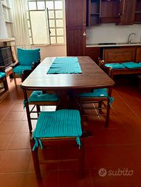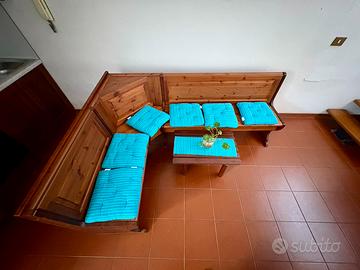 Vendo lotto completo coordinato in legno massello, stile rustico/country, in ottime condizioni. ✔️ Materiali di qualità (legno massello) ✔️ Set completo e coordinato ✔️ Cuscini originali inclusi (tessuto turchese) ✔️ Ideale per casa di montagna, taverna o sala da pranzo Incluso nel lotto: – Cassapanca angolare a L (203 × 142cm) – Divanetto 2 posti (122 × 65cm) – 2 poltrone (73 × 67cm cad.) – Tavolo allungabile (chiuso 190 × 90cm, aperto 370 x 90cm) – 4 sedie e 2 sgabelli con paglia di Vienna – Cuscini originali Tutto in ottimo stato, usato con cura. Nessun danno rilevante. 📍 Solo ritiro a mano 🚚 Consigliato furgone per trasporto 📦 Disponibile subito Prezzo: 550 € trattabili (Vendita veloce – precedenza a chi conferma)