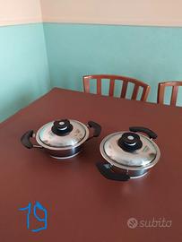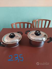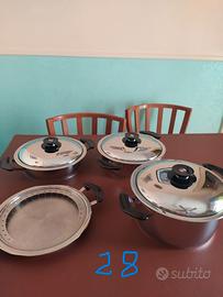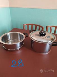 Vendo set di pentole completo da cucina composto da 11 pezzi di cui: - 4 pentole da 28 x 6,5/9/13 H cm di cui una è una bistecchiera, 50 euro l'una; - 1 pentola da 28 x 16H cm con annesso scolapasta, 100 euro la coppia; - 2 pentole da 23,5 x 12/8H cm, 50 euro l'una; - 2 pentole da 19 x 6,5H cm, 30 euro l'una; - 1 pentola 37x23x12H cm, 50 euro. Le pentole sono perfette, non sono annerite né dentro e né fuori, sono pulite, nessuna ammaccatura o incisione o crepa, in acciaio inox, non compatibili con induzione, di marca AMC. Non scambio con nulla.