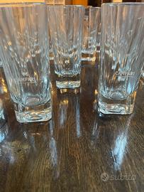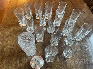 "Set 16 bicchieri vintage Campari originali, anni '80 In vetro spesso, logo bianco serigrafato + shaker pubblicitario Campari in vetro trasparente lavorato a rilievo, con elegante tappo in metallo cromato ed elegante logo Campari sul coperchio. Altezza circa 22cm.
