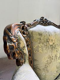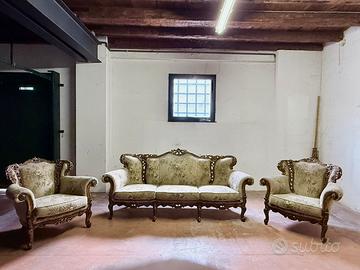 Soggiorno in stile barocco adatto a locali, case, piani di palazzo. Tapezzeria in ottime condizioni, senza macchie, nessun odore. Legno intarsiato senza sbeccature, borchie intatte e complete. Imbottitura in buonissime condizioni.
