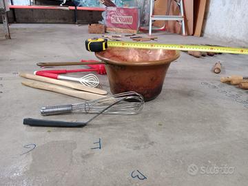 Set composto da paiolo in rame per polenta e vari attrezzi da cucina.
