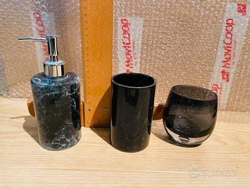 Questo set é composto da : porta saponette in formato cilindrico e rettangolare, porta spazzolini e porta pettini é ideale per chi vuole dare quel tocco in più di eleganza al suo bagno pur essendo minimale nell’arredo fornendo diverse opzioni adatte ad ogni esigenza.