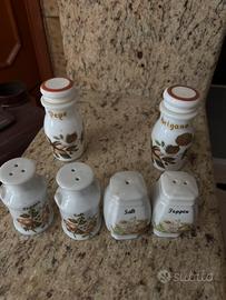 •2 set di saliere e pepiere (uno tondo e uno squadrato, con decorazioni floreali e scritte “Salt” e “Pepper”)