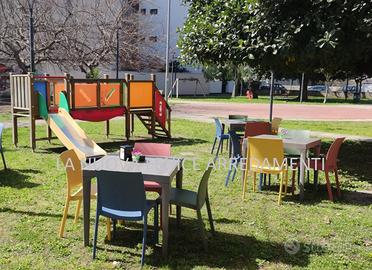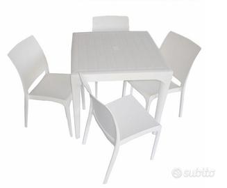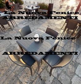 Set contract per locali stabilimenti ristorante pizzeria composto da tavolo 80x80 piano effetto legno nei colori bianco tortora e antracite + sedie a scelta tra le colorate o la sedia conchiglia bianca tortora e antracite.
