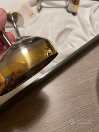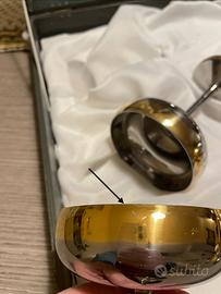Set composto da 6 coppe, 6 cucchiaini ed un vassoio. Di marca Facix, in acciaio inossidabile 18/10 al nickel-cromo con bordino oro zecchino. Con contenitore integro che presenta segni di usura (vedere foto).