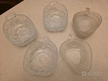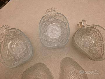 Vendo set di 9 coppette in vetro trasparente lavorato, spesso e resistente (5 a forma di ananas e 4 a forma di fragola) ideali per servire macedonia, gelato, dessert o frutta secca. In condizioni perfette, mai utilizzate, praticamente come nuove. Cedo ad euro 20,00 e disponibile alla spedizione (gestita da subito.it).