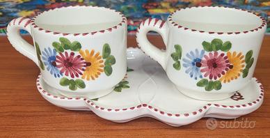 Set di due tazzine da caffè in ceramica, con piattino coordinato, decorate con la scritta Lui e Lei e cuoricini.
