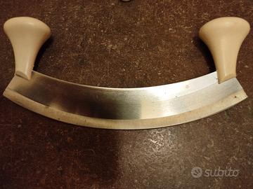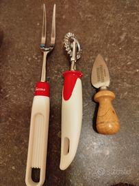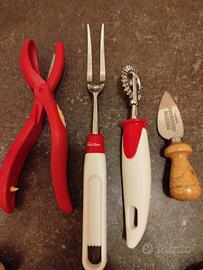 Set cucina composto da: mezzaluna, attrezzo per taglio caldarroste, forchettone e rotellina dentellata Pedrini, coltellino Parmigiano Reggiano. Mezzaluna usata ma in buone condizioni, restanti articoli nuovi.