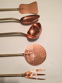 Set cucina in rame e ceramica decorata in blu su fondo bianco completo di appendino, totale pezzi n.6.