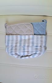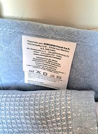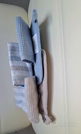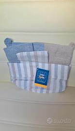 Set cucina portapane Eurospin con 6 pezzi: 1 cestino, 3 strofinacci e 2 presine. Colore azzurro e grigio/beige Nuovo con cartellino.